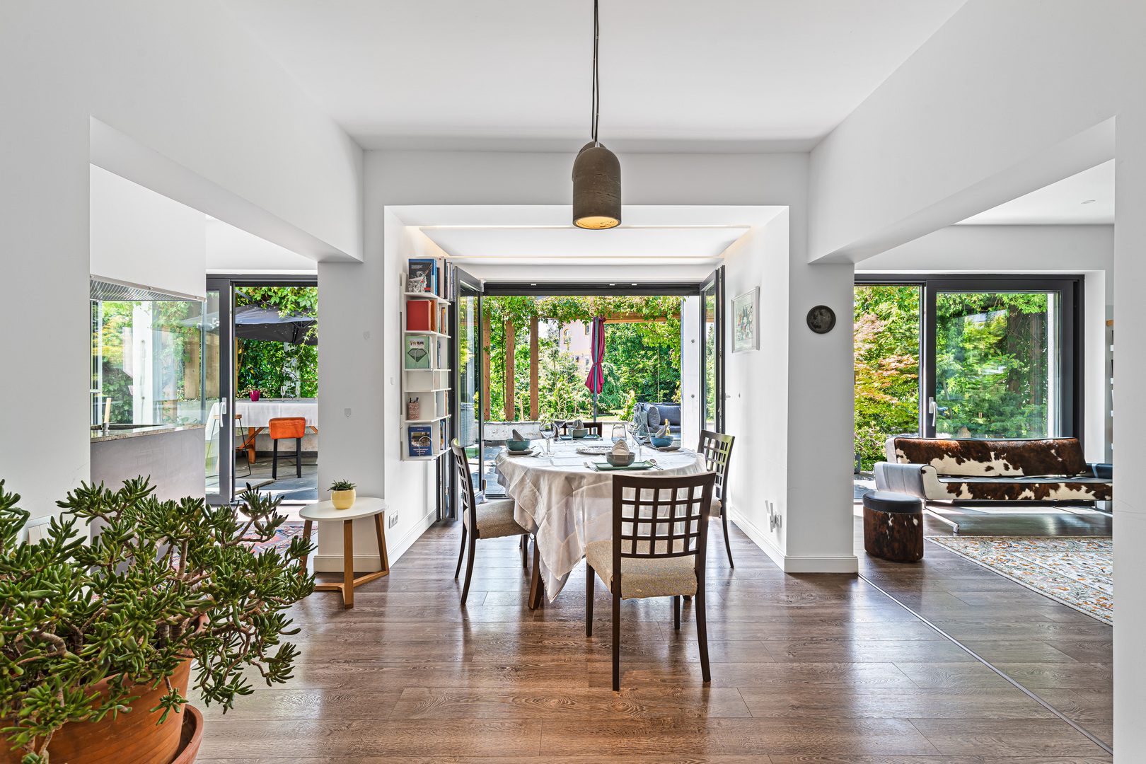 A családi ház földszintjén helyezkedik el a tágas nappali, étkező, konyha hármasa, melyek közvetlenül kapcsolódnak egy zöld növényzettel árnyassá varázsolt, körülbelül 25 négyzetméteres teraszhoz, ami remek helyszínül szolgál családi, baráti összejövetelekhez, grillezéshez, hangulatos ebédekhez, vacsorákhoz. A családi konyha minőségi gépekkel felszerelt, sok tárolási lehetőséget rejt, hatalmas főző szigete gránit pulttal borított. Az étkezőben kandalló varázsolja meghitté a téli estéket. Ezen a szinten található továbbá egy dolgozónak vagy vendégszobának használható helyiség, fürdővel.