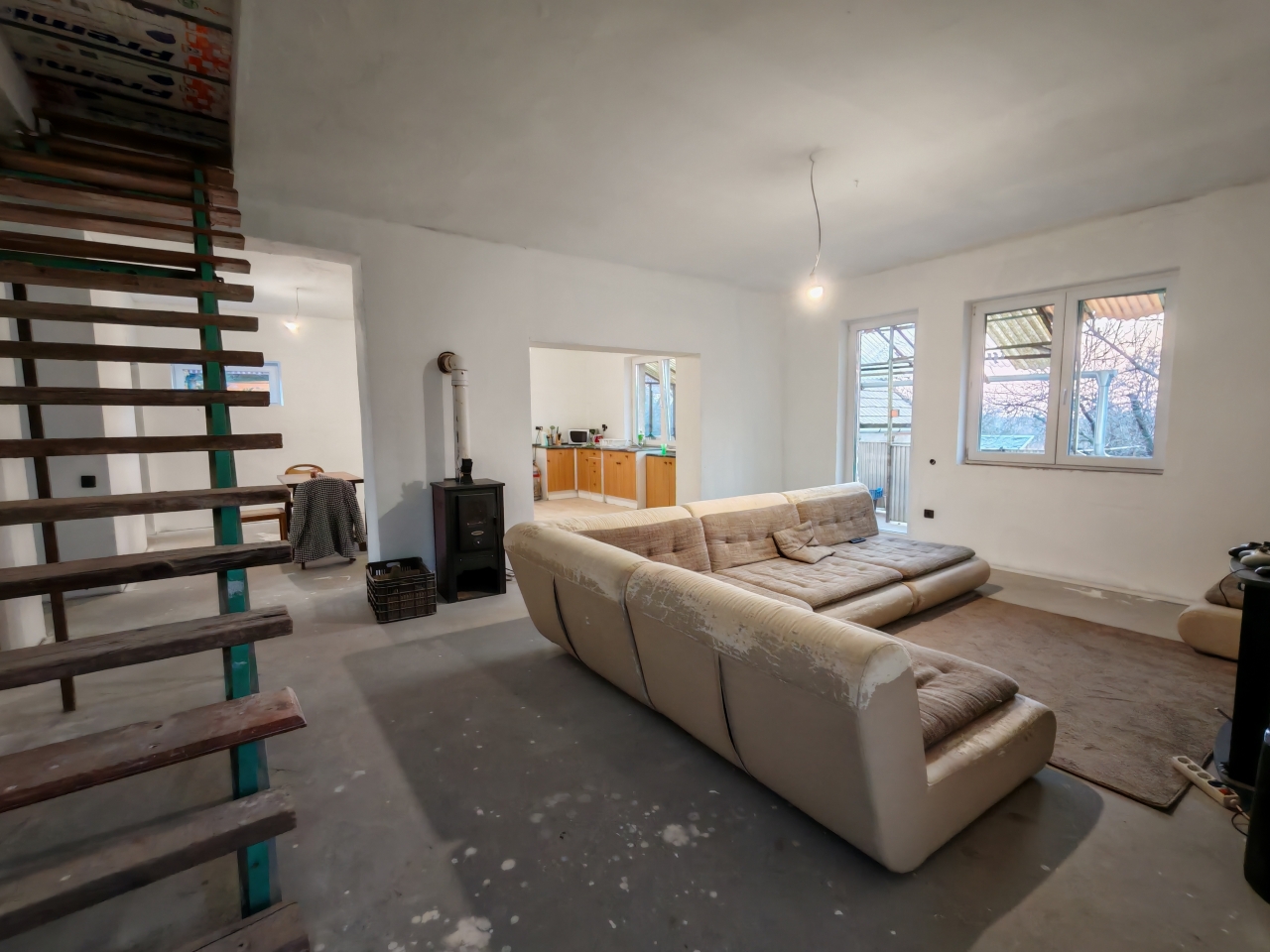 A földszinten előszoba,nappali, konyha és étkező egybefonódó harmóniája öleli körül az érkezőket. Óriási térben (59 nm) egy kisebb fal választja el a nappalit és a konyhát amibe egy kályha van jelenleg bekötve,de hangulatos kandallóvá alakítható.