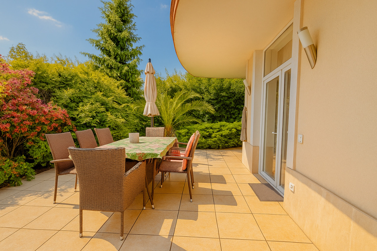 Az emeleti szint egy külön világ: tágas terek, több szoba és egy nagyméretű terasz, ahonnan lenyűgöző panoráma nyílik Szentendrére és a környező dombokra. Ez a lakás akár teljesen önállóan is használható, hosszabb távú bérbeadásra is alkalmas.