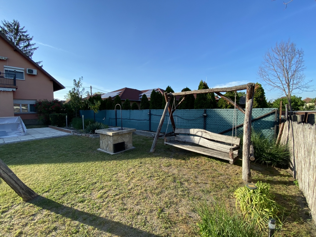 A 720 m2-es füvesített, gondozott, fúrt kúttal ellátott kertben helyet kapott egy gépesített 3x6 méteres medence, valamint egy 2 autó számára helyet adó automata kapuval rendelkezős garázs is.