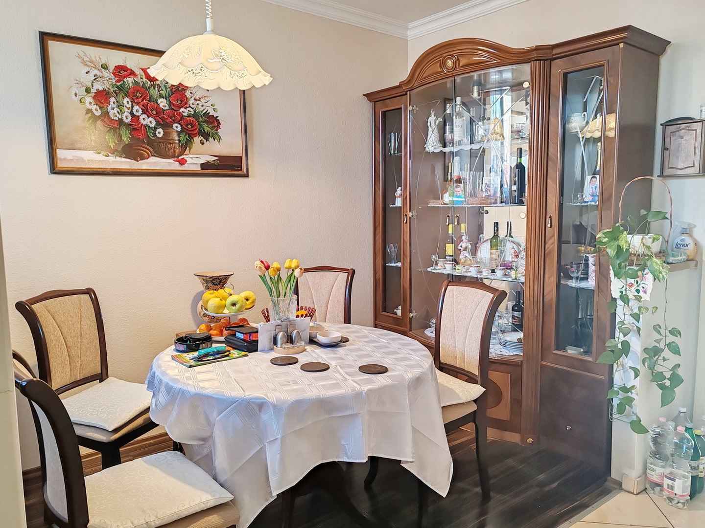 Az első kis szoba nyitott lett és étkezőnek lett átalakítva. A konyha modern, nagy ablakokkal ellátott.