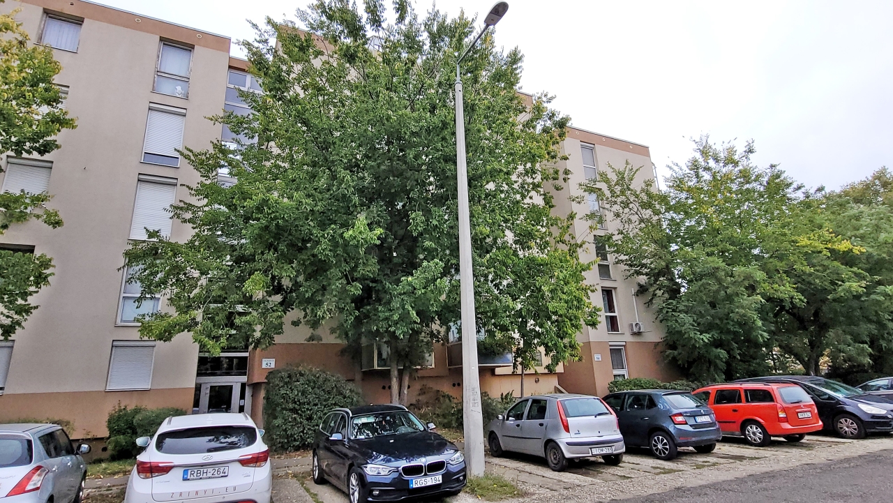 A nappali az Ady Endre út felé néz, a két hálószoba az épület mögötti csendes parkra.