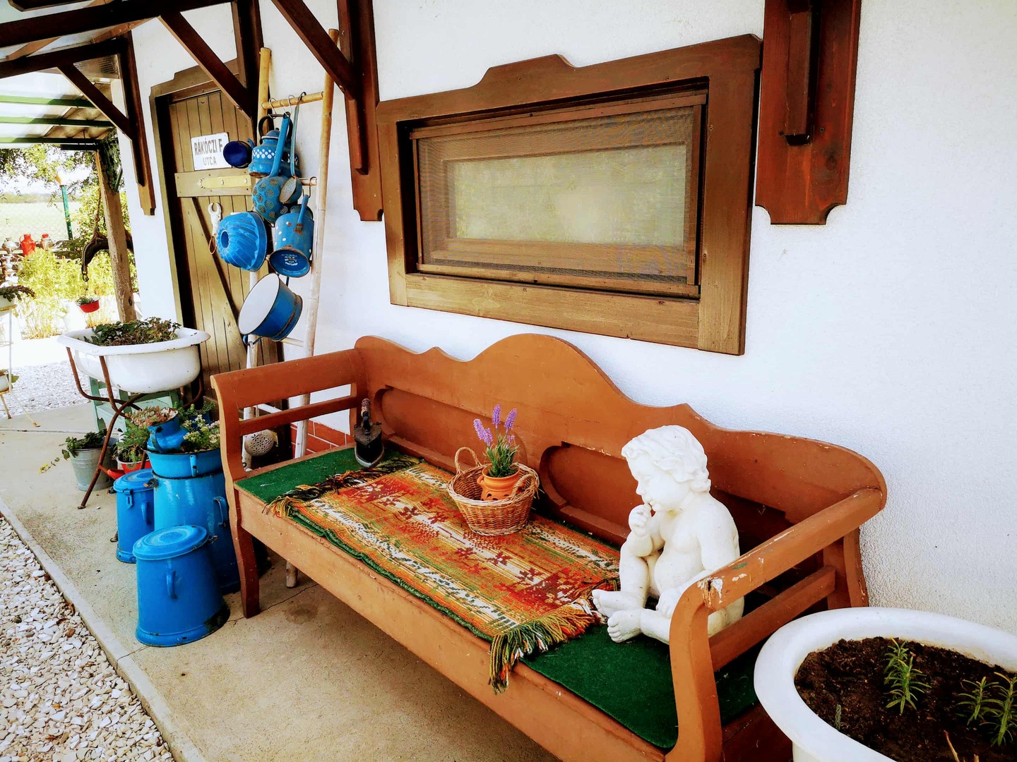 nyitott, hagyományos veranda régi korok használati tárgyaival berendezve,