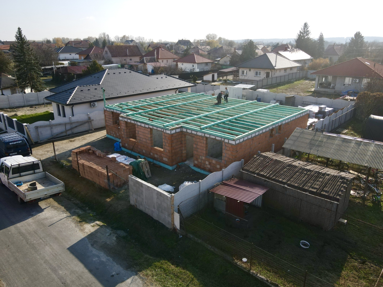 Az épület Porotherm P30N+F téglából, betonkoszorúval és fa födémes tetőszerkezettel készül. A lábazat 10 cm vastag lépésálló polisztirol, a homlokzat 10 cm-es Austrotherm grafitos hőszigetelést kap, a vízszintes födém pedig 25 cm ásványgyapot szigeteléssel kerül kialakításra.