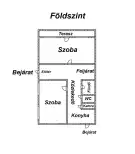 - elosztása: ( földszinten): konyha, kamra, WC, Fürdőszoba, 2 szoba. Emeleten: 2 szoba, zuhanyzó+Wc,