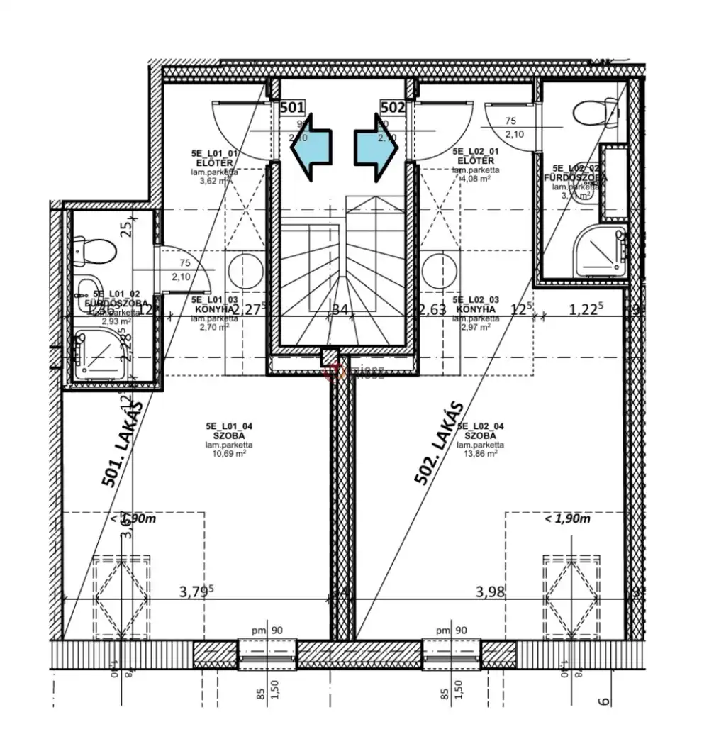 - tetőtéri (nettó 21-23 m2, bruttó 26-29m2) erkély nélküli lakások.